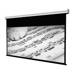 Pantalla de proyección Eléctrica, proyección frontal, formato 16:9. Superficie con bordes negros de 5 cm y trasera opaca negra. Carenado: Aluminio Blanco. Proyector recomendado: 16:9 (FULL HD, 4K) Diseño de carcasa exclusivo. Superficie GRIS de alto contraste. Salida en avance de la tela. Imagen nítida sin trama. Uniformidad de imagen (eje asimétrico). Contrapeso lastrado del tipo lágrima para una proyección estable. Disponible con carenado NEGRO bajo demanda